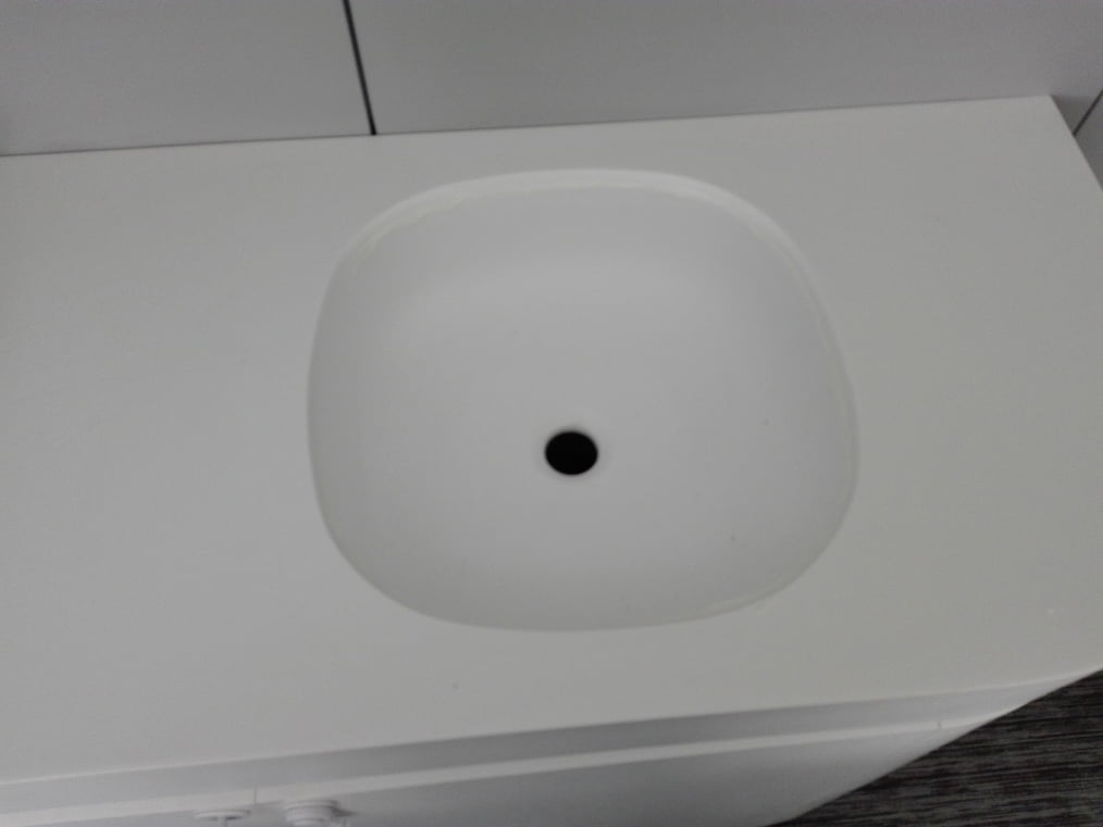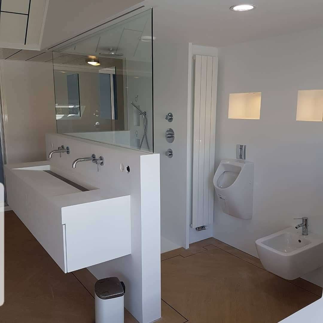 In deze badkamer zijn wanden van solid surface gemonteerd en is het wastafelmeubel van solid surface gemaakt.
