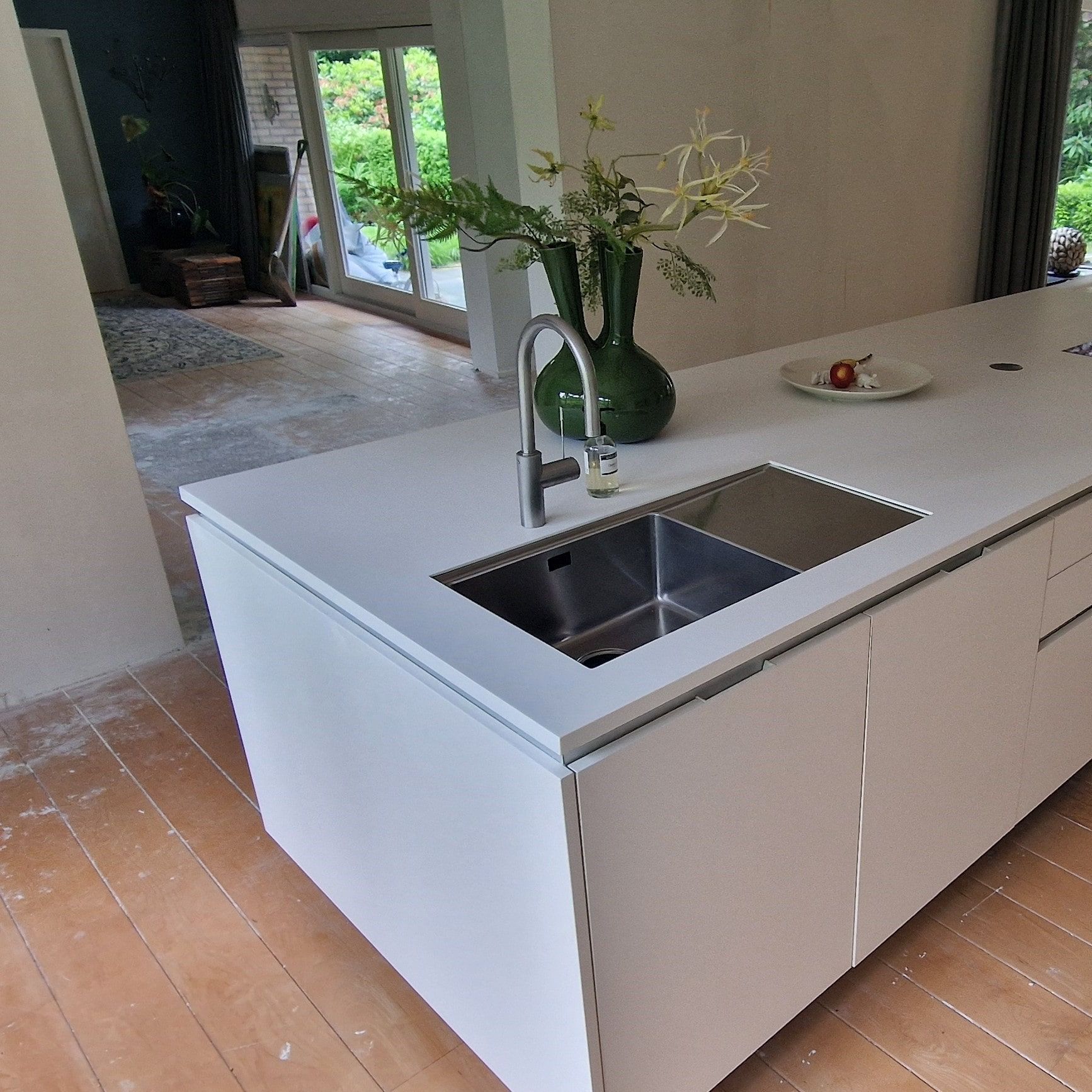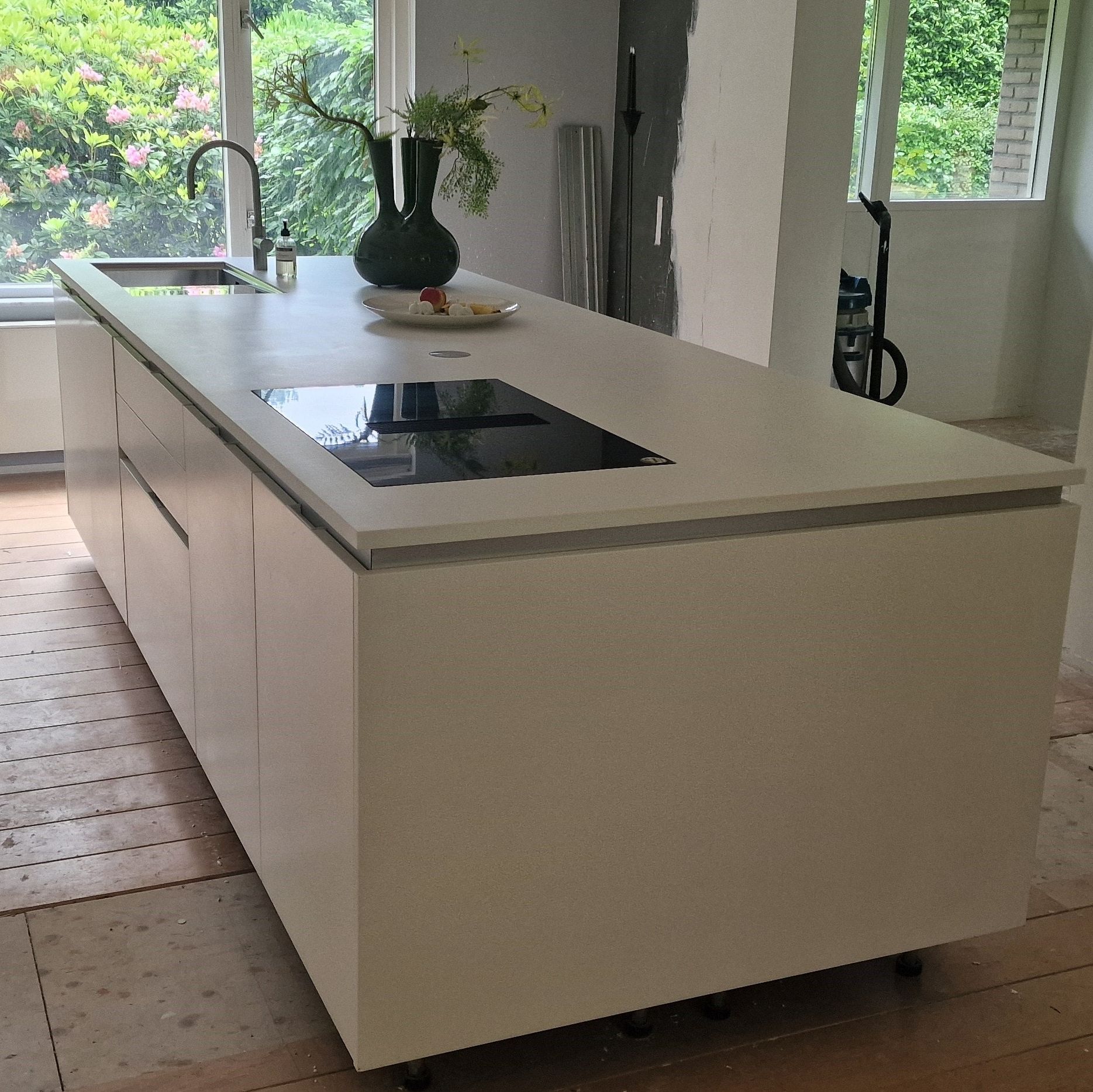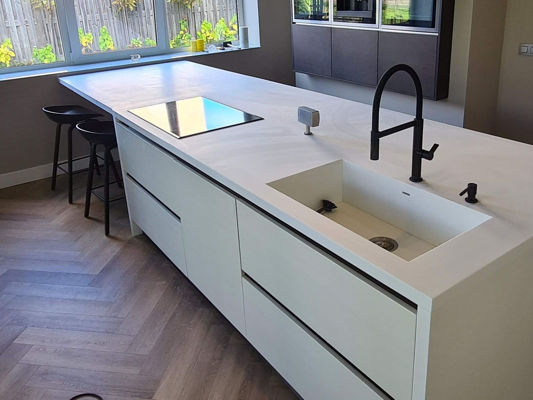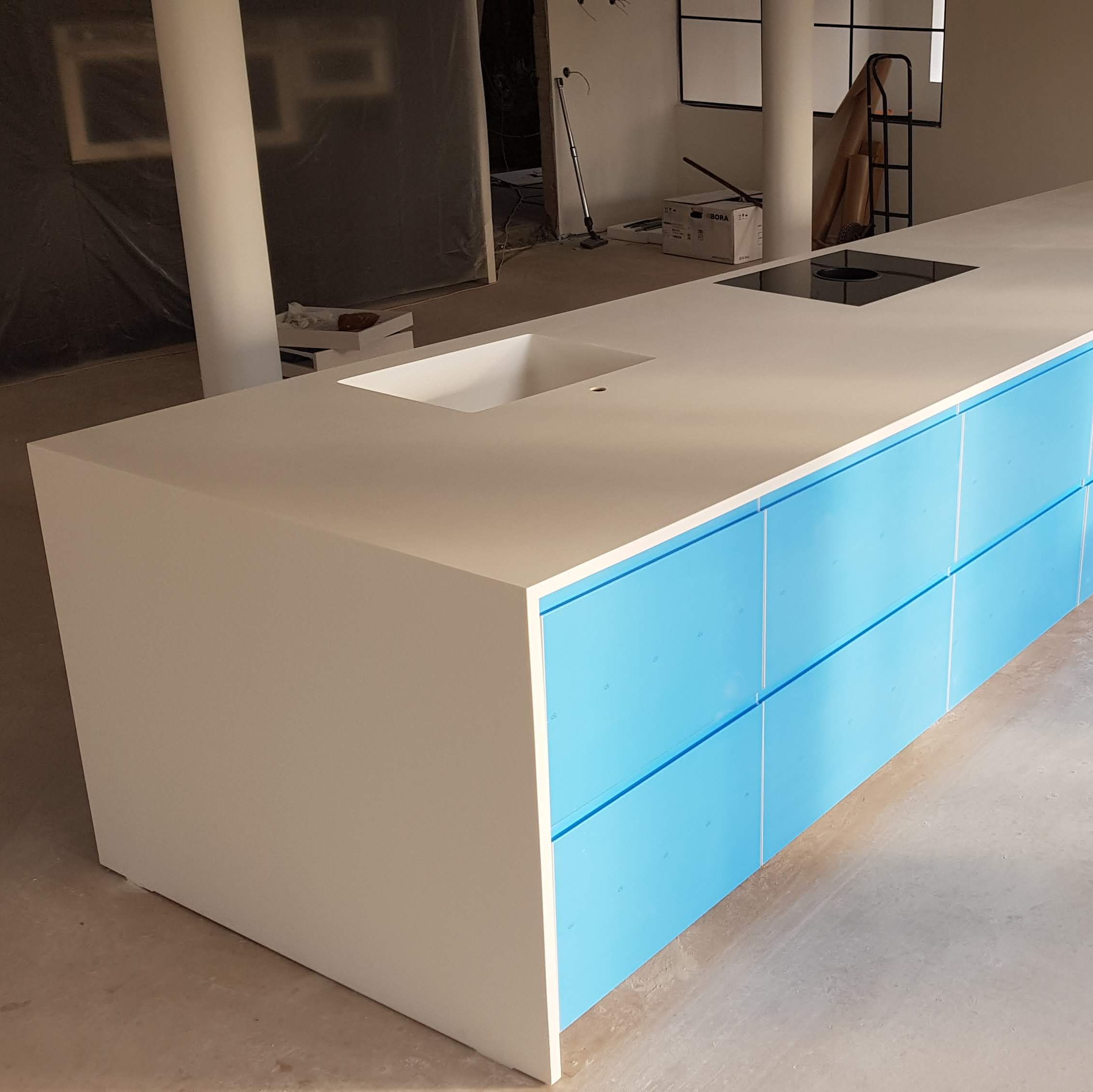 Op deze foto's is te zien hoe een keukenblad vervangen is en een spoelbak en kookplaat is ingebouwd.