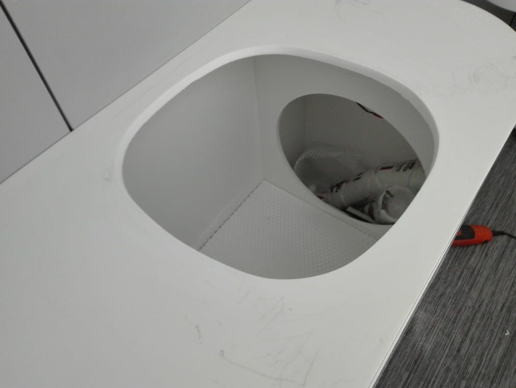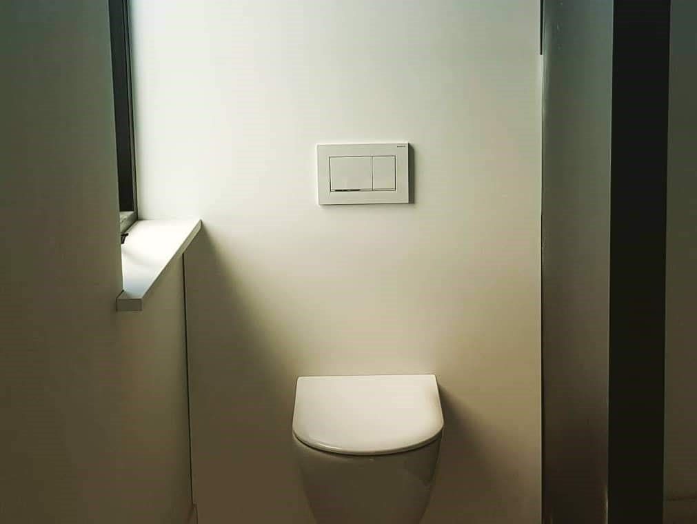 Op deze foto's is te zien hoe een solid surface achterwand gemonteerd is in een toilet.